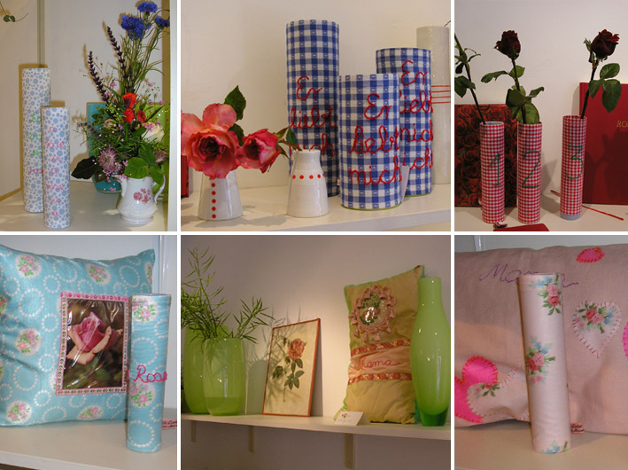 Blumenbar, Frankfurt am Main, 2005 Accessoires zum Thema Rosen, Kissen und abnehmbare Vasenhüllen, verschiedene Stoffe, bestickt.