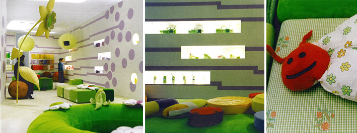 Alle Gegenstände und Objekte (Spielzeug , Tiere, Kissen, Rauminstallationen wie 3m hohe Blumen) sind aus Stoff genäht.