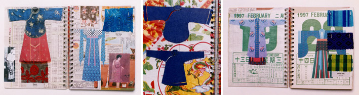 Zusammenstellung von Textilmustern in Form von Kollagen. Die Bücher lagen im Ausstellungsbereich für die Besucher aus und informierten über die aktuellen Farb- und Formtrends. Die Stoffmuster sind mit Namen und Standnummer versehen.