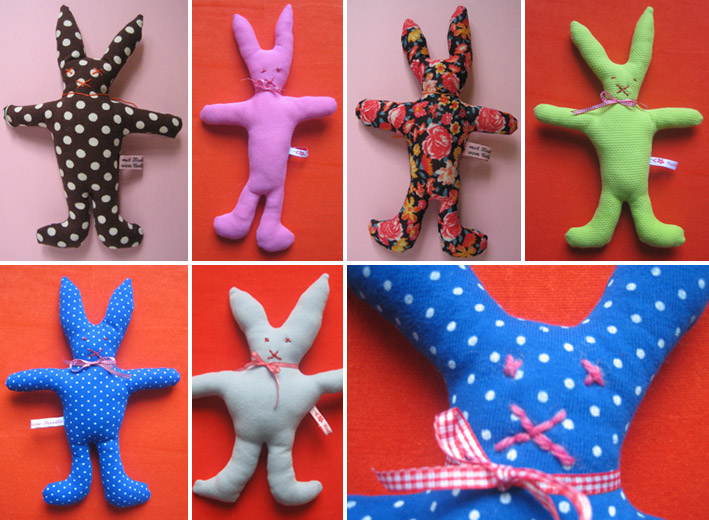 Hasen aus verschiedenen recycelten Stoffen mit handgestickten Gesichtern.