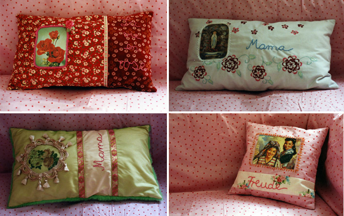 Kissen mit auswechselbaren Bildmotiven. Kombination verschiedener Textilien (Tüll, Samt, bedruckter Baumwollstoff), bestickt. Drucke in Einsteckhüllen.